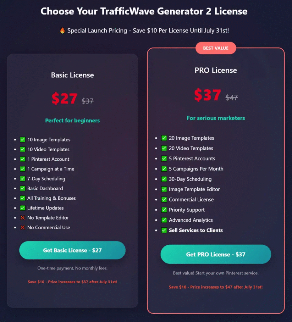 TrafficWave Generator 2.0 is offered with two simple pricing levels.